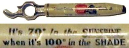 After reading about the Tweetsie Railroad Corkscrew in the December 9, 2007 issue, reader Jean Louis Desor submitted a picture of his "railroad" corkscrew. This picnic corkscrew / bottle opener is advertising the Sunshine Special train of the Missouri Pacific Lines. the Sunshine Special began operating on December 5, 1915 between St. Louis, Little Rock, Austin and San Antonio.