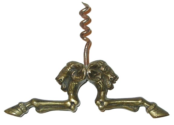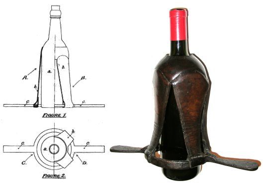 Above right is a bottle guard made of leather mounted on a cast iron base. The guard slides over the top of a bottle. One holds it in place and the bottle down by stepping on the two pedals on the side. This gives an assist in pulling the cork and also protects the user in case of glass breakage. In a c.1870 Farrow & Jackson a similar "Bottle Guard" is pictured.