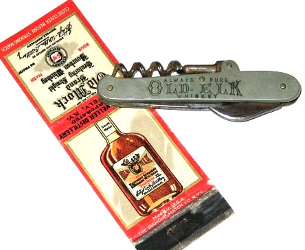 A combination knife / corkscrew advertising "Always Pure Old Elk Whiskey" with a go-with matchbook depicting a bottle of Old Elk Whiskey.