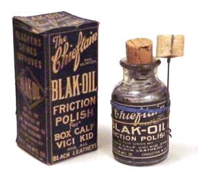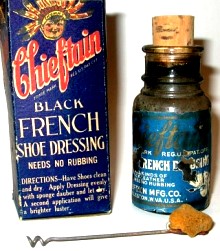 Chieftain claimed their French Shoe Dressing "Improves - Renews all black leathers giving a lasting brilliant luster. Easy shoe economy - 5 minutes a day." In addition to the French shoe dressing, the firm offered "Cake or liquid white shoe dressing, black, tan or oxblood paste shoe polish, blak-oil liquid shoe polish, and stove polish paste."