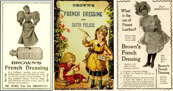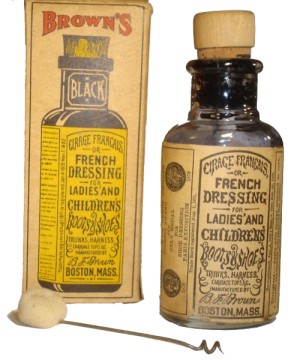 On an advertising trade card from Brown is "Brown's French Dressing is a brilliant, lasting and reliable Polish which does not hurt the shoe or soil the skirts in wet weather. It has polished Shoes, Trunks, Bags, and Harness for forty years, and is know everywhere ... BE SURE You Get BROWN'S!"
