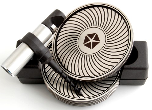 A picnic corkscrew complete with six coasters showing the Chrysler Pentastar emblem. Siegfried Hölterscheit, Huckelhoven, Germany was granted 1989 American Design Patent No. D-301,532 for this set, June 13, 1989. The patent title is "Combination Coaster Set, Corkscrew and Bottle Opener". Chrysler introduced the Pentastar emblem in 1962.