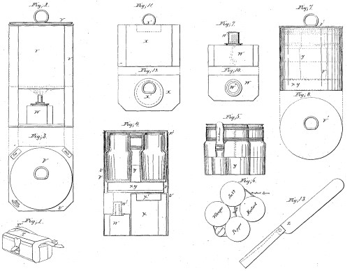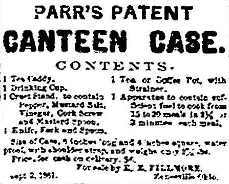 This advertisement appeared in several 1861 - 1862 issues of the Daily Zanesville Courier (Ohio). The contents of the case are (1) Tea Caddy, (1) Drinking Cup, (1) Cruet stand to contain Pepper, Mustard Salt, Vinegar, Cork Screw and Mustard Spoon, (1) Knife, Fork and Spoon, (1) Tea or Coffee Pot with Strainer, and (1) Apparatus to contain sufficient fuel to cook from 15 to 20 meals in 2 1/2" to 3 minutes each meal. The case measured 6" x 4" x 4". It was waterproof and weighed 2 3/4 pounds. It was sold by E. E. Fillmore in Zanesville.