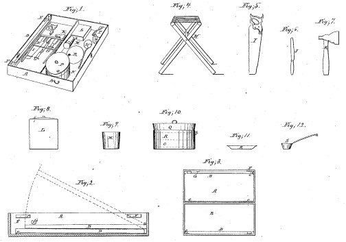 Aha! A Corkscrew! After seeing the advertisement we search Google Patents and there we found Parr's U. S. Patent Number 32643. The Buffalo, New York toolmaker granted the patent on June 25, 1861 two months after the start of the Civil War. He wrote that he "invented certain new and useful Improvements in Camp-Chests and Appurtenances for Soldiers." His patent is much larger in scope than the canteen case in the Fillmore advertisement. The chest includes a foldable table, camp stools, a kettle, a frying pan, a wash bowl, and many other items. Also listed in the chest is a canteen case which Fillmore opted to offer. In his patent, Parr details the items listed above including the "cork screw".