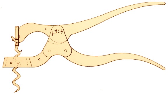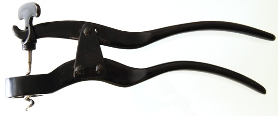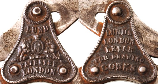 On April 2, 1855 William Lund and William Edward Hipkins were granted British Patent Number 736 for "Improvements in the manufacture of corkscrews". The patent drawings include a rack and pinion, a roundlet, and a lever. The lever drawing is shown above. The operation is simple. First screw the worm into the cork. Next slip the bottle under the collar on the lower arm and hook the hole in the worm handle with the end of the upper arm. Squeeze the arms together and the cork is extracted. Variations do exists and the hinges of each lever are worthy of close examination.