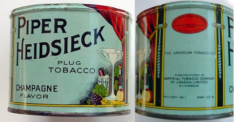 After viewing the Heidsieck Gallery in last week's issue, reader Ron MacLean emailed the above photo with the notation "Attached is an image of a Canadian Piper Heidsieck Plug Tobacco tin with naive corkscrews on label."