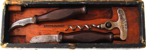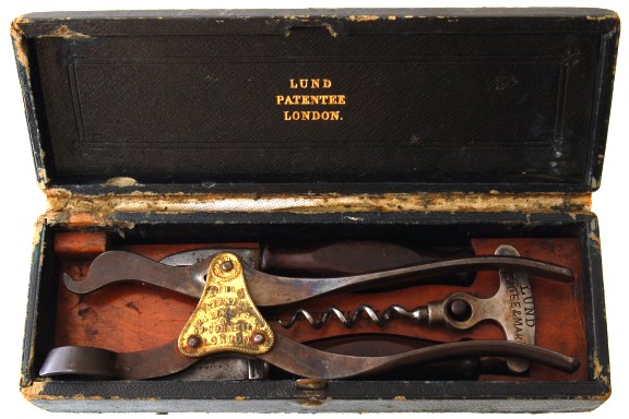 A Lund Lever in an original presentation case. The wood insert is cut to fit each piece. A dowel keeps the corkscrew in position. The corkscrew is marked LUND PATENTEE & MAKER or one side and 57 CORNHILL & 24 FLEET ST. LONDON on the other side. There are cutouts for the Champagne knife and capsule cutter.