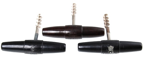 "You have a brown one marked HOBSON and MADE IN AUSTRALIA (top center of photo) squirreled away in a drawer otherwise filled with horn handle corkscrews. All Hobson corkscrews have a worm which screws into the shaft half way up the shaft and writing moulded into the plastic handles. They were made in the 1950s in Melbourne by the H. R. Hobson company which is now long gone. I am sending you two of these with advertising moulded into the handle."