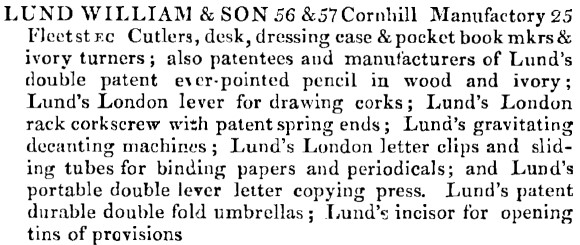 Corkscrew collectors are much more familiar with the Lund's 1855 patent lever discussed with a photo gallery in the August 1, 2008 issue. What else did Lund do? Here's an listing from the 1884 Business Directory of London: