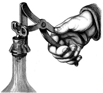 From the September 4, 1869 issue of the Scientific American: "Improved Cork Extractor. Our engraving shows a simple and powerful implement for extracting corks from bottles, patented Jan. 14, 1868, by James Morton, of Philadelphia. It consists of three bars pivoted together, which, together with the corkscrew, constitute the entire apparatus. One of the bars has a socket or cap at its lower end, which is placed on and around the nose of the bottle. Near the upper end of this first post or bar is pivoted the end of the second bar, near the middle of which the third bar is pivoted. The second and third bars have handles at their outer ends, and at the inner end of the third bar is a hook. This hook engages with the corkscrew in the manner delineated in the engraving, and by forcing the handles together or pressing them downward, the cork can be easily extracted. The instrument is equally adapted to extracting corks on which rings or hooks are already formed so that no corkscrew is needed. For further particulars address James Morton, 912 South Eighth street, Philadelphia, Pa."
