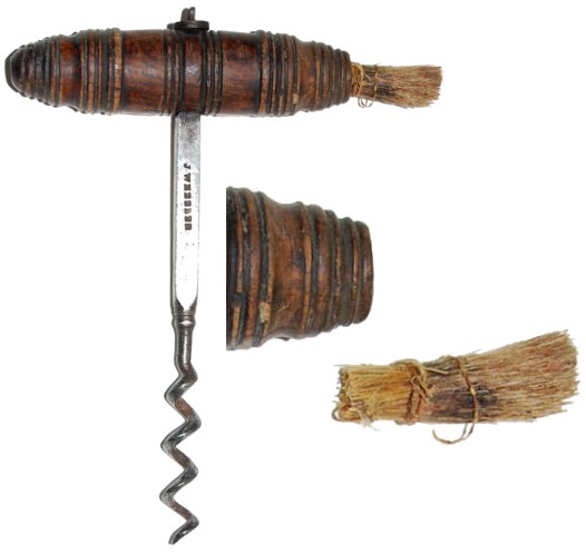 Reader Ron MacLean wrote: "Have you ever wondered how the brushes were put in an English corkscrew? About three years ago I was given an early 19th century English corkscrew marked J. WHEELER that had the original brush still present. The brush insert had dried up and loose in the handle end but had not fallen out. I have attached a picture showing the brush which was initially wrapped with a thin cord (hemp/ linen?) and then glued in place. Inside the brush socket hole were remnants of the cord as often seen in handle sockets when brushes are lost or removed."