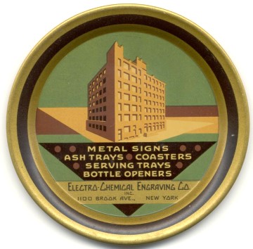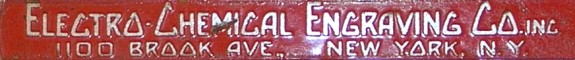 The 1921 EMF Electrical Yearbook has this listing: "The Electro-Chemical Engraving Company, Brooklyn, N. Y. Manufacturer of electrical instrument dials and name plates for electrical machinery. Business established 1900. President and treasurer, Frederick E. Switzer; Vice-presidents, N. L. Jacobus, F. H. Southwick, R. Schlezinger; secretary and sales manager, N. L. Jacobus; treasurer, N. L.. Jacobus. Main office, 440-458 19th St., Brooklyn, N. Y. Branch office, 52 Vanderbilt Ave., New York, N. Y." In this same directory The Metallograph Corporation is listed at 1100 Brook Avenue, New York which would later become the home of Electro-Chemical Engraving.