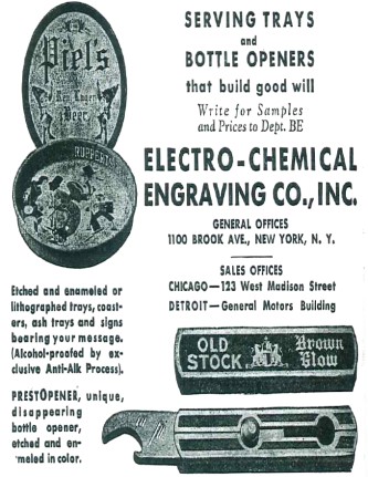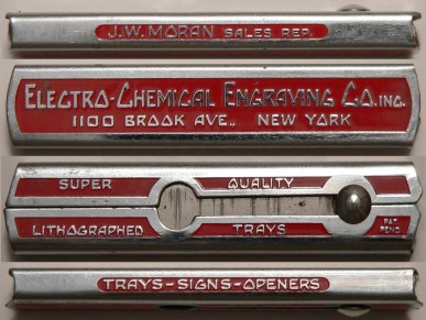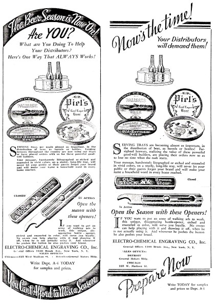 1930s advertisements for the slide out from the Electro-Chemical Engraving Co. of New York proclaim "If you want to put an army of walking ads to work, this unique, disappearing bottle opener, etched and enameled in color, will serve you loyally. No owner can help playing with it and showing it off, when he is not actually using it. And whenever he pushes the button, he also pushes your brand!" The advertisements appeared in the American Brewer.