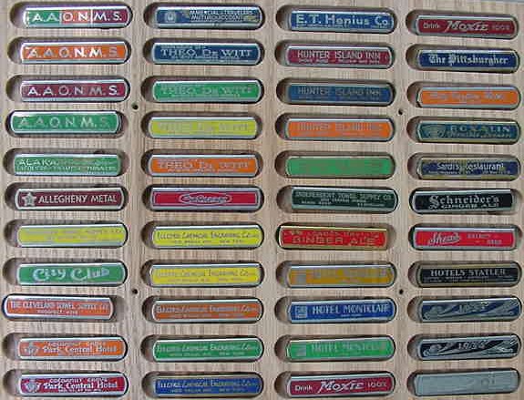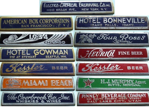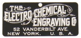 The 1906 Automotive Industries directory has this listing: "The Electro-Chemical Engraving Company, 450-458 Nineteenth street, Brooklyn, N. Y. is offering to the automobile trade a line of name plates etched in brass for attachment to cars and all sorts of machine tools. These are made in any desired style and size and are artistically designed. The wording appears in raised letters on a dead black sunk background. Holes are provided in the ends of the plates for attaching to the machinery. The design is etched shallow or deep, as preferred, but the company recommends deep etching, since it is more enduring. The makers, who received the highest award for metal name -plates at the St. Louis Exposition, also manufacture clock and meter dials, scales, metal signs, etc." The 1906 American Trade Directory also lists the firm in Brooklyn