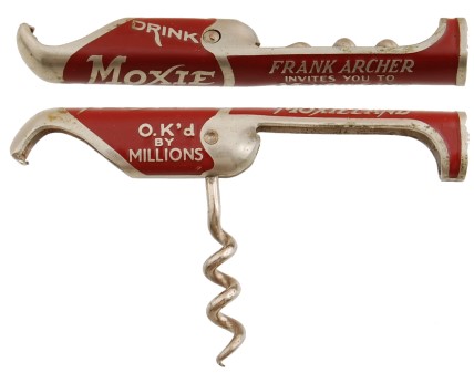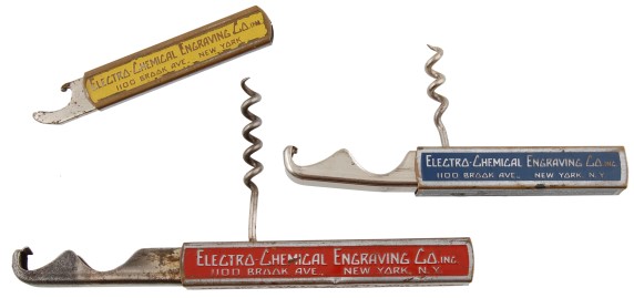 The slide out combination corkscrew and bottle opener from Electro Chemical Engraving Company can be found with a number of different advertisements in a variety of colors. Even more can be found without the corkscrew and either an over-top-style opener or lifter type opener. Although they are marked PAT. PEND., no patent issued has been found.