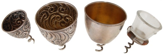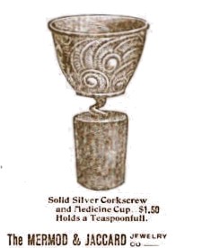 John Henry Zeilin of Philadelphia, Pennsylvania, filed for a U. S. Patent for his "Dose-Cup Bottle-Stopper" on August 5, 1881. Patent number 254,760 was issued March 7, 1882. In his application, Zeilin wrote "Much inaccuracy in the measurement of family doses of medicine arises from the varying sizes of spoons by which they are usually administered." He says that his invention can be made to hold a "tea-spoonful, a dessert-spoonful, or a table-spoonful." Four variations of the dose cup are shown in the photograph. At left and right are tea-spoonful size and the two in the middle are a table-spoonful. The three silver cups on the left have the mark of S. Cottle & Company, New York, N. Y. (1877-1920).