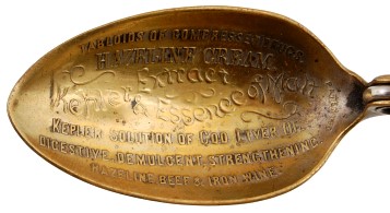The spoon on the left has the mark of Currier & Roby, New York, N. Y. (1900-c.1943). The second spoon in the photograph is marked PATENTED and advertises "Tabloids of Compressed Drugs Hazeline Cream, Kepler Extract & Essence of Malt, Kepler Solution of Cod Liver Oil, Digestive, Demulcent, Strengthening, Hazeline, Beef & Iron Wine." The third spoon has the mark of George W. Shiebler & Co., New York, N. Y. (1876-1910). The table spoon on the right is marked STERLING without a maker's mark and it has a gold wash.