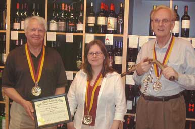 Shown in the photograph are the first three members of the Williamsburg Chapter (from left, Bill Bean, VP, Heather Hatcher, President and Paul Luchsinger, Secretary). Luchsinger is shown holding a large corkscrew made from an elk antler. "It takes a big corkscrew to open all those bottles," joked Luchsinger, who boasts a large collection of unique and antique corkscrews. Currently there are eight members in this chapter, with meetings held at The Wine Seller.