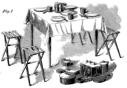 Improved Camp Chest. The two accompanying engravings are pictures of the same thing, though one represents it as a table spread with a cloth, set with dishes, and supplied with seats for three persons, while in the other it appears as a moderate-sized box or chest. Though the chest is only 31 inches in length, 14 in width, and 10 in depth, and weighs but 40 lbs., it contains the following articles: 3 web-seat camp stools, made of the best hickory, and folded together; hatchet, saw, carving knife and fork, 3 flasks, that will, in the aggregate, hold one gallon; tea caddy, coffee caddy, wash bowl, dipper, 8 plates, 4 knives and forks, 4 each of table and teaspoons, tea and coffee pot combined, with a strainer; frying pan, pot for boiling, 3 drinking cups, sugar and milk bowl, cruet stand for pepper, salt, mustard and vinegar, with mustard spoon and cork screw combined; 1 apparatus for boiling tea or coffee, and fuel for 20 meals; 2 table cloths, and 2 towels.