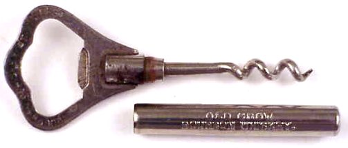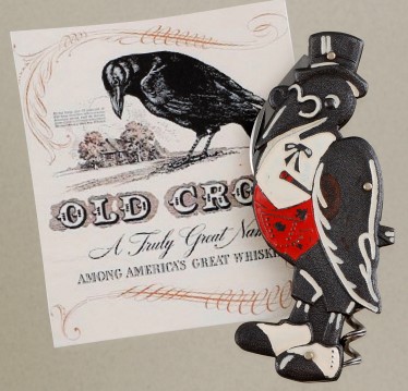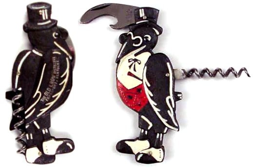 The Old Crow cap lifter / corkscrew was made by Paul A. Henckels in Germany. Advertising on the back of the tuxedoed crow is "The Old Crow Distillery, Frankfort, Kentucky." The handles (crow) are cast iron and the blade is stainless steel. The fluted wire helix folds flush to the body.