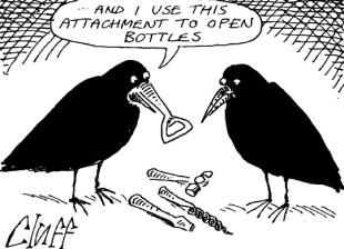 The drawing was inspired by a story about how the rook has been identified as the cleverest English bird because it has learned to use tools. It can even bend a piece of wire to help it winkle a worm out of a tube.