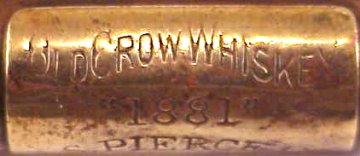 In 1897 William A. Williamson was granted a U. S. patent for his invention of a corkscrew which is concealed inside a small bottle or bullet shape roundlet. The ends thread together and when unscrewed, a helix pivots at an angle to the base. The two pieces are then screwed back together to form the handle. The Old Crow Whiskey advertising plaque on this roundlet is from S. S. Pierce. S. S. Pierce started a provisions business in Boston in 1831. They were representatives in Boston for Old Crow Whiskey. The bottom of the bullet is marked WILLIAMSON CO., NEWARK, N.J., PATENTED JUNE 1 97.