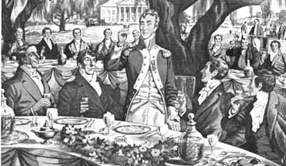 The painting in this 1949 advertisement is an image of James Crow and the Marquis De Lafayette in 1825.