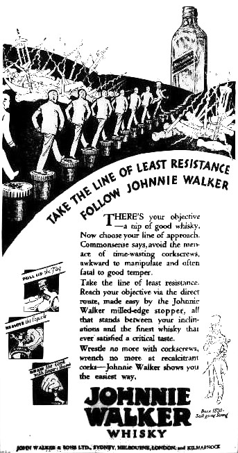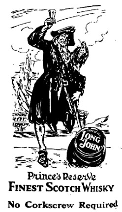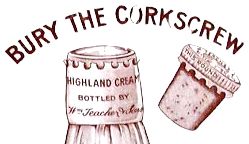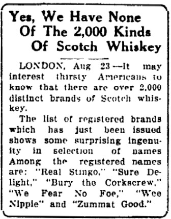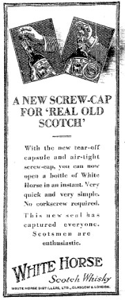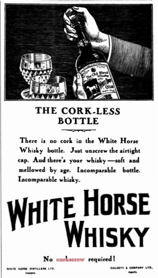 While all of this advertising for Whiskys with the new stopper that didn't require a corkscrew was going on in New Zealand, Australia and elsewhere, the United States was in the middle of "The Great Experiment" - Prohibition. There was no public push for stoppered whisky bottles that didn't need a corkscrew. We did find, however, a notice that included the "Bury the Corkscrew" slogan in the August 23, 1923 issue of the Coschocton Ohio Times. Alas, it was printing news from London:
