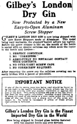 Gilbey's Gin also joined the "No Corkscrew Required" campaign with this advertisement which appeared in several 1928 issues of the Winnipeg Free Press.