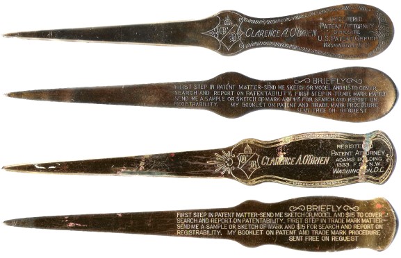 Have you ever looked at letter openers while rummaging through a dealers "smalls" case looking for corkscrews? If yes, chances are you have seen a promotional one from Clarence O'Brien, Patent Attorney, offering his services and his procedures booklet.