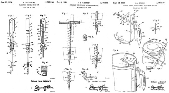 The signatures of both O'Brien and Harvey B. Jacobson appear on Patent No. 2,512,238 of June 20, 1950 issued to R. I. Nakamura for a "Frame with Slidable Tool Bit" (with corkscrew); Patent No. 2,524,595 of October 3, 1950 issued to H. E. Jacobsen for a "Corkscrew with Pivoted Lateral Protection'; and Patent No. 2,717,526 issued September 13, 1955 to W. J. Cronin for a "Closure Opener with Slidably Adjustable Gripper" (with corkscrew).