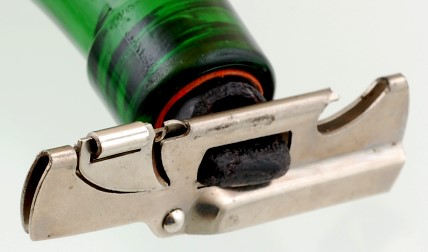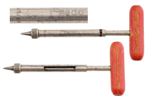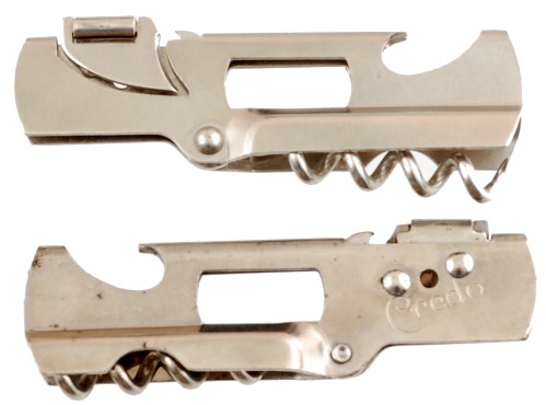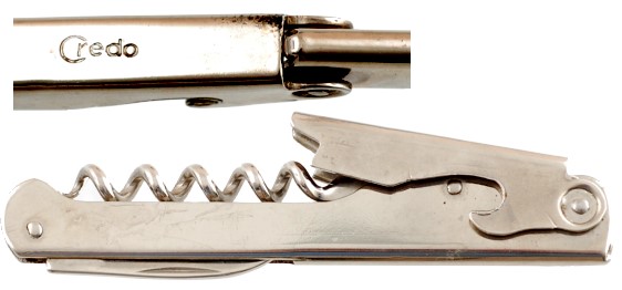 Of particular interest to corkscrew collectors is this combination tool produced by Credo. It is a corkscrew, a can opener in the P-38 style, a bottle cap remover, and it also will remover stoppers on bottles as shown in the photo below.