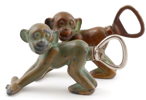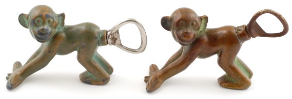 On pages 7 and 8 of Figural Corkscrews, I discussed Fakes, Frauds, and Fantasies. I cited the monkey with a Williamson corkscrew stuck in his rear end as something that could have been a single creation of a craftsman. By drilling a hole in the hollow monkey's rear, he could insert the Williamson sheath and have a new figural corkscrew. Oftentimes, we consider a questionable "corkscrew" like this to fall into the "fantasies" category. But what happens when a second one turns up? That find is pictured above. They came from opposite coasts of the United States! Note the difference in the position of the corkscrew! Did the craftsman make two? Were they made in a factory? Do any readers have another? Email