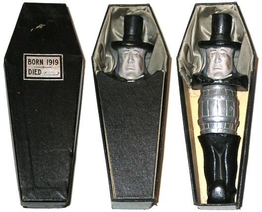 The figure in the casket was a design patent of Stratford, Connecticut resident Horace Bridgewater and was assigned to the Artistic Bronze Company of Bridgeport, Connecticut. Design Patent Number 87,618 for a "Combination Bottle Opener and Dispensing Apparatus" was issued August 23, 1932. The coffin is 6 1/2" long and is marked PATENT APP'D FOR COPYRIGHT 1932 inside the lid.