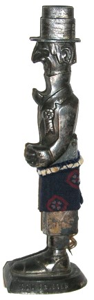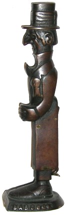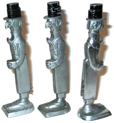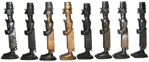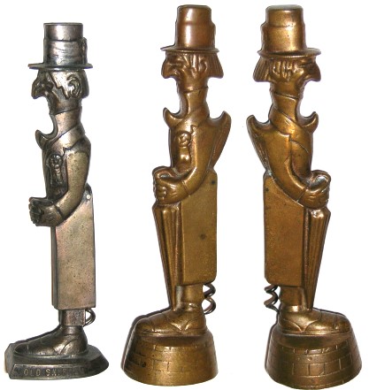 The rarest of the Kirby corkscrews is shown at right compared for size to the "standard" Old Snifter. It is solid bronze, unmarked and 180mm tall. Have you noted the significant differences from the other Demleys?....This one has two cap lifters and, suddenly, we find him carrying an UMBRELLA!