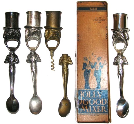 The design patent of the Trumbull, Connecticut resident Alfred Flauder was assigned to the Weidlich Bros. Mfg. Co. of Bridgeport, Connecticut. Design Patent Number 87,658 was issued for a "Bottle Opener" on August 16, 1932. The combination corkscrew, bottle opener, jigger, and cocktail spoon was sold as a "4 - in - 1 Friendship Kit" and called "Jolly Good Mixer".