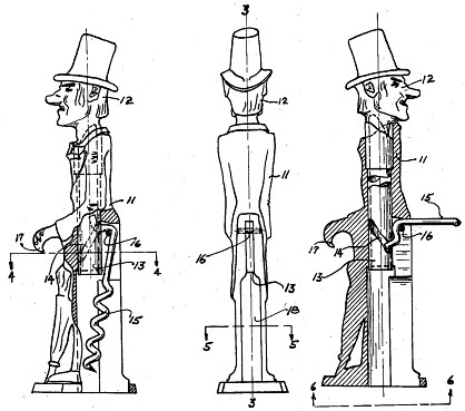 The "Negbaur" name also appears on the parrot corkscrews which were the design patent of M. D. Avillar of New York (#78,554 issued on May 21, 1929). Negbaur received many design patents from the 20s through the 50s for bill clips, pocket flasks, cigarette lighters, and other utensils. His cousin Hal Negbaur of New York knows very little about him other than to say that he was "always -tinkering with something." Many of the figures without turning head are marked "Demley". Schuchardt's son vaguely recalled that "Demley may have been the legal guy from Great Neck that working with my father and the manufacturer."