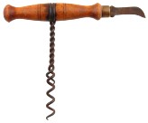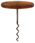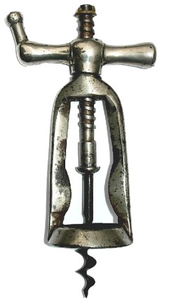 There are several kinds of corkscrews. That which has been the longest in use is the simplest. For several hundred years it was the best, until a genius added an improvement which brought it to perfection. The primeval corkscrew consisted of a wire, pointed at one end, twisted into a spiral with about five turns tempered to give rigidity to it, and provided with a wooden handle like that of a gimlet. The spiral part of the wire was about two inches long after being twisted, the part left straight was about the same length, and the wooden cross piece was round, and about three inches in length and half an inch in diameter. The handle was made fast to the metal by putting the wire through a hole in the wood and clinching it. The metal was not burnished, nor was the wood polished or painted. It is safe to say that there never was a corkscrew job which could not have been accomplished with one of these primeval corkscrews.
