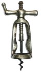 shaped like the bow of a jews harp, is substituted for the wooden handle, and the stem of the spiral is fastened between the ends of the bow with a pin in such a manner that the implement may be shut up like a pocket knife. This pattern of portable corkscrew is adapted for excursion or picnics, where there may be bottles of milk to be opened [see "Barnes 1884 Patent" below]. There is also a very elaborate kind of corkscrew sold in some of the drug stores and cutlery establishments. It is nickel plated and looks as formidable as a toy steam engine. It is so constructed that after it has been adjusted the engineer has only to keep on twisting and the cork will be hoisted high and dry [see "Chinnock 1884 Patent" below]. There are a few rules regarding the use of the corkscrew which are generally observed by the elite. The place for the corkscrew is not by the side of the hostess's plate. Champagne bottles are not opened with a corkscrew, nor condensed milk cans, nor cocoanuts. Any person who has tried to take small cucumber pickles from a bottle with a corkscrew will ever afterward endeavor to have a pickle fork at hand, if he does not go to the extreme of having the pickles removed from the original package before they are brought to the table. It may be set forth as general rule that any attempt to utilize the corkscrew for any purpose other than the removal of corks will result in embarrassment, and had best not be tried except in privacy.