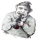gripped between the knees , and a lifting force is applied to the corkscrew and through it to the cork. The removal of the cork is accompanied by a sound which may be fairly imitated by putting the left forefinger in the mouth with its end against the inner surface of the right cheek, inflating the cheeks, and then removing the finger by a quick push against the yielding right hand corner of the mouth. His perfected corkscrew has the blunt end of the wire brought back through the wooden handle and twisted around the stem of the corkscrew till it comes down to the top of the spiral, where it is would into a concentric coil. When the spiral has sunk into the cork the blunt end of this coil strikes against the cork near its periphery, and with the purchase thus obtained the cork is turned around in the neck of the bottle and withdrawn far more gently than with the unimproved corkscrew [see Clough Patent below]. A good article of the perfected pattern may be bought for about fifteen cents in almost any general store in the country. In a cutlery establishment in the city the price would not be over seventy-five cents.