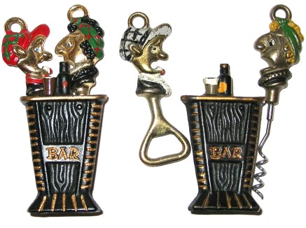 These cartoon characters were created by Reginald Smythe and the cartoon strip ran for many years in the Daily Mirror from 1957. Andy has a lazy disposition and always has a cigarette end on his lower lip. His passions are beer, pigeon racing and avoiding work. Flo usually attempts to spur him into action but with little success. The figures and the bar come in a variety of colours. Andy, the cap lifter, is cast in one piece and therefore the corkscrew is always Flo.