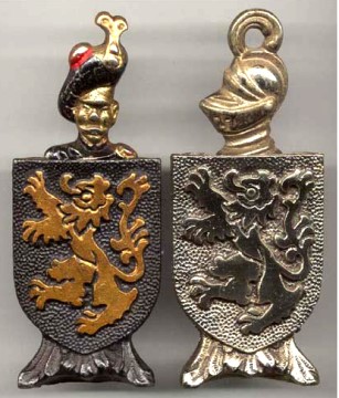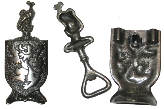 Gladman's second design of 9 December 1958, Registration number 891381, was again for "A combined bottle opener and mantel ornament". The registration photograph shows that this shield with lion rampant has a cap lifter clipped behind. In practise it is more common to find it with a corkscrew - and there are two versions : a helmet and a Scotsman. Both shields have a mark cast into the back REG. No. 891381.