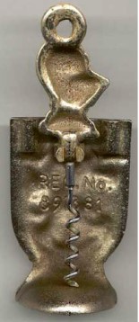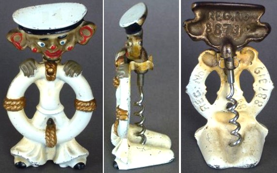 The actual example of the cast metal sailor corkscrew clipped behind a lifebelt is marked inside the head REG. No. 887319. On the back of the lifebelt it is marked REG. No. 887319 and also 887318. This is not a common corkscrew (would you have bought one?) and one wonders on what basis it was designed, especially as it was a mantel piece ornament. It is not a particular pretty thing to look at. Who was the sailor meant to represent?