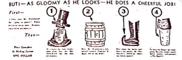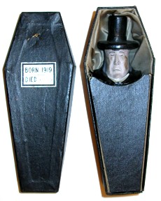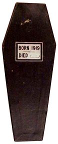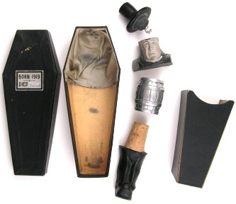 Stratford, Connecticut, August 23, 1932 - Horace M. Bridgewater has a bit of a morbid attitude in his bar tool creation. He has taken the Prohibition figure cartooned by Rollin Kirby in Vanity Fair magazine and made him into a "Combination Bottle Opener and Dispensing Apparatus." The fellow is packaged in a 6 1/2" long casket and includes a corkscrew hat, a jigger midsection and a cap lifter leg/foot with bottle corker.