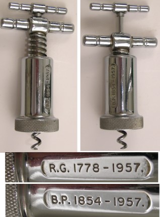 Does anyone know the significance of the marks on this corkscrew (R.G. 1778-1957 and B. P. 1854-1957)?