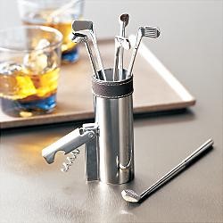 They are all have a two ounce jigger, a corkscrew, and a bottle cap lifter. The pistol and the short jigger also have a can piercer (on the worm cover).