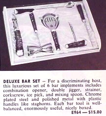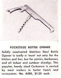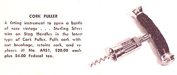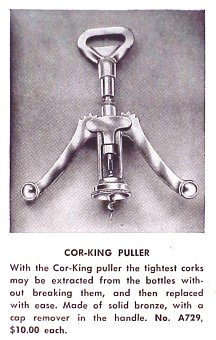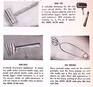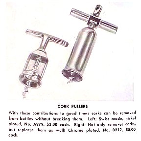 The Bar Mart was a mailorder firm at 62 West 45th St., New York City. During the late 1940s and 1950s their catalogs offered a wide range of home bars and bar accessories. Here are the corkscrews featured in the 1940s Tippler Catalog: