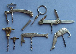 Top Left:A single lever waiter's friend by Jacques Perille, Paris. It is marked EXPRESS JHP PARIS. The worm folds neatly into the handle with the top of the worm folding into the indentation on the left. The formed neckstand folds to the handle. There is a beast head on the end of the handle.