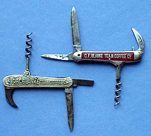 The top knife advertises "Blanke's Coffee -Faust Blend & Grant Cabin Tea." The bottom on reads "Blanke's Coffee - Faust Blend & Exposition Brand." |
