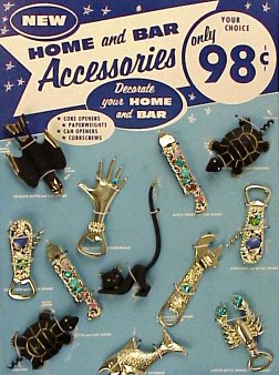 14" x 19" counter display from the Metalart Company of Rhode Island offering a variety of cheesy bottle and can openers, corkscrews, paperweights, and pretzel holders. The black cat in the middle is the pretzel holder.